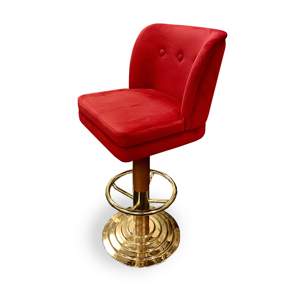 Style Matter upholstered the Encore Bar stools with a Parisian-inspired fabric for this late-night Speakeasy in Edinburgh. ‘As you enter, guests are immediately dazzled by a certain ‘Je Ne Sais Quoi’ lighting installation in the entrance hall and the bar lounge features chic red velvet sofas and rich textile upholstery.’