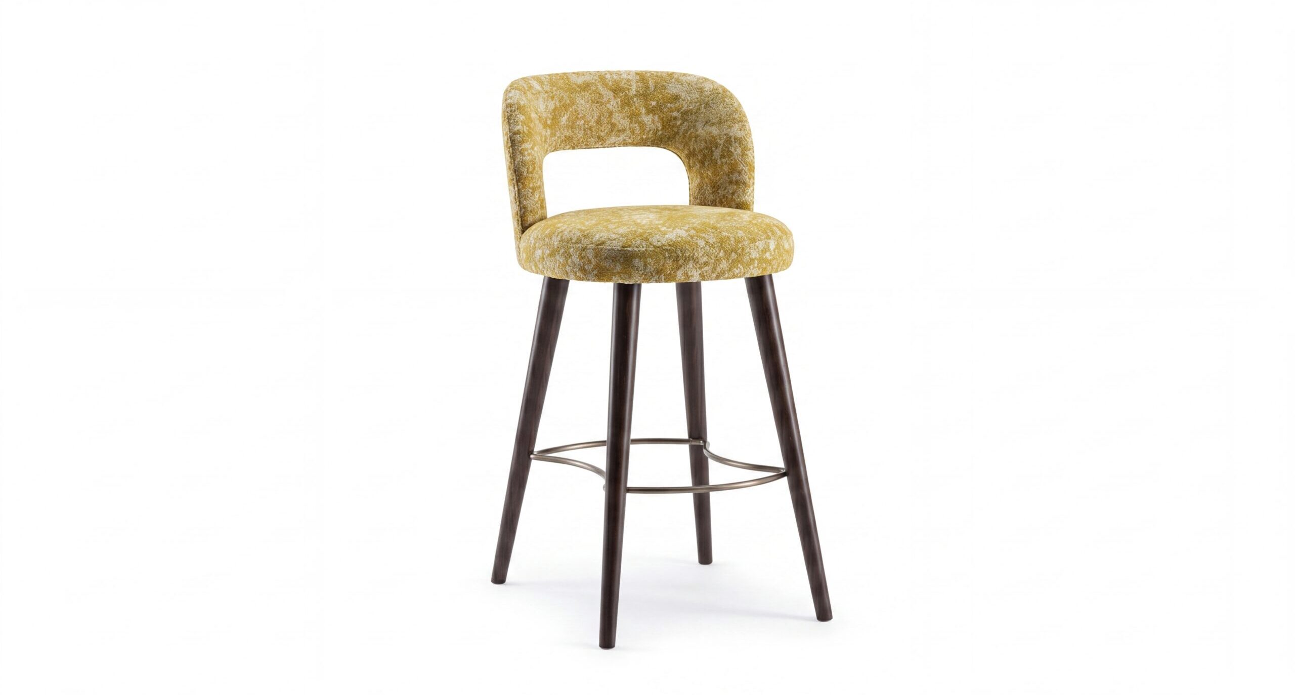 A design based on precise proportions, high quality and attention to detail is what characterises the collection. Wooden legs and an upholstered seat gives simplistic elegance. The peep opening at the back of the chair adds playfulness, making this collection a sleek option for quirky yet stylish interior spaces. The Holly 065 SG bar stool is shown here upholstered in Pierre Frey’s Cezembre 'Le Manach' coloured yellow N3139; alternative fabrics may be specified to suit individual client requirements. Manufactured in Beechwood. Minimum Quantity 2no. Caps | M1 Chrome / M2 Polished Brass / M4 Black Nickel / M5 Antique Bronze Caps | M1 Chrome / M2 Polished Brass / M4 Black Nickel
