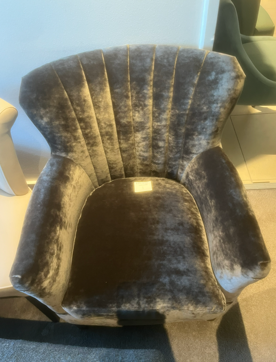 GREY VELVET ARMCHAIR, £50 X1, SHOWROOM CLEARANCE