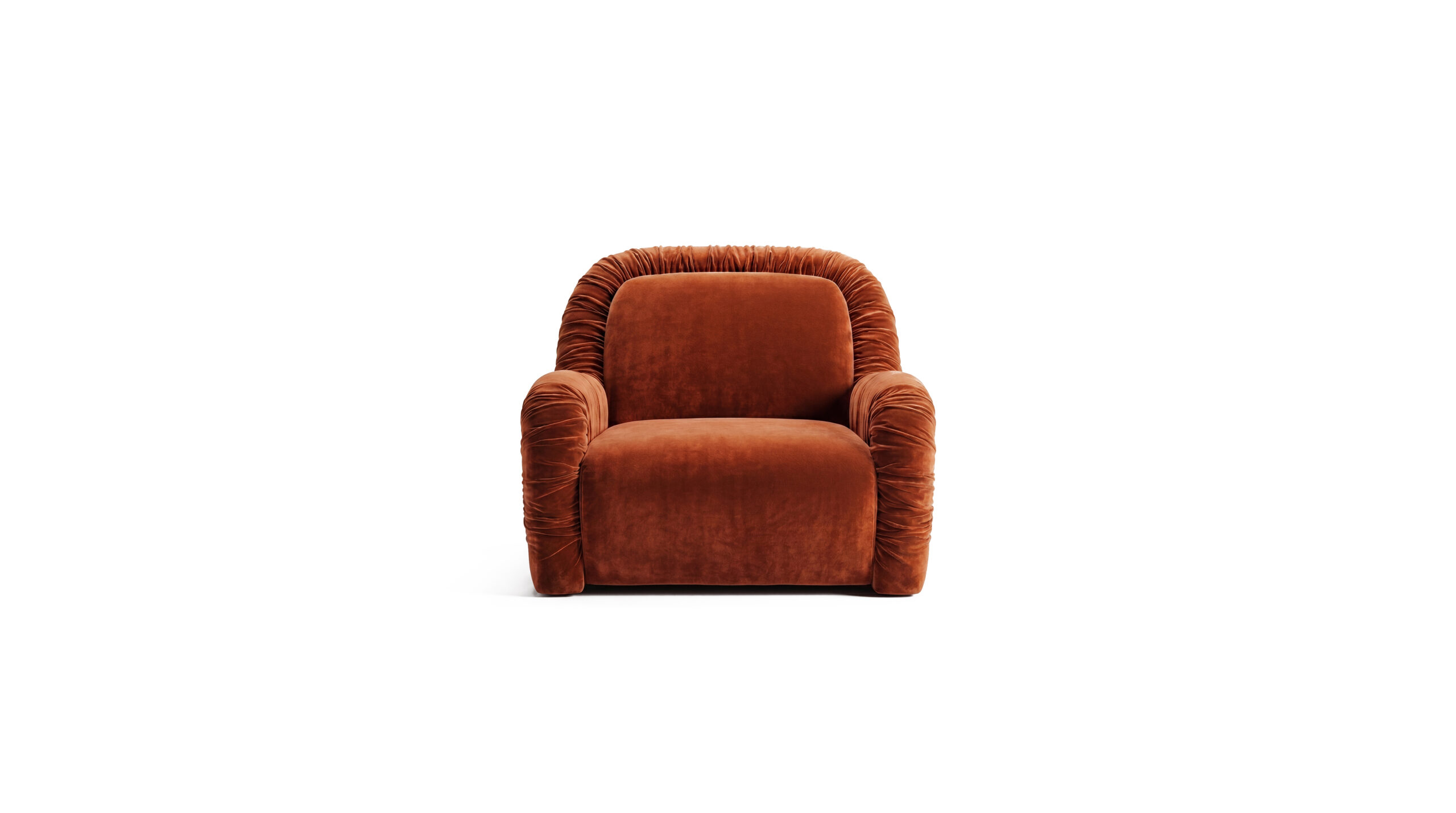 Signature gathered detailing along the arms introduces texture and depth, giving the piece a distinctive, expressive quality. The deep seat and supportive backrest offer a relaxed yet elegant seating experience.
